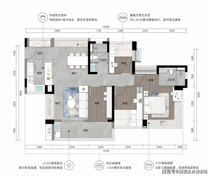 极致豪宅化户型|约106m²四房两厅两卫👈中式厨房配备西厨岛台,LDK一体化设计,约5.6m景观阳台,约12m四开间朝南,主卧三飘窗+270°景观面,豪宅因素一个都不少