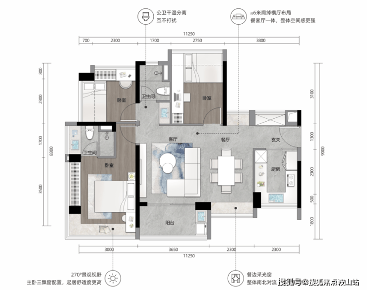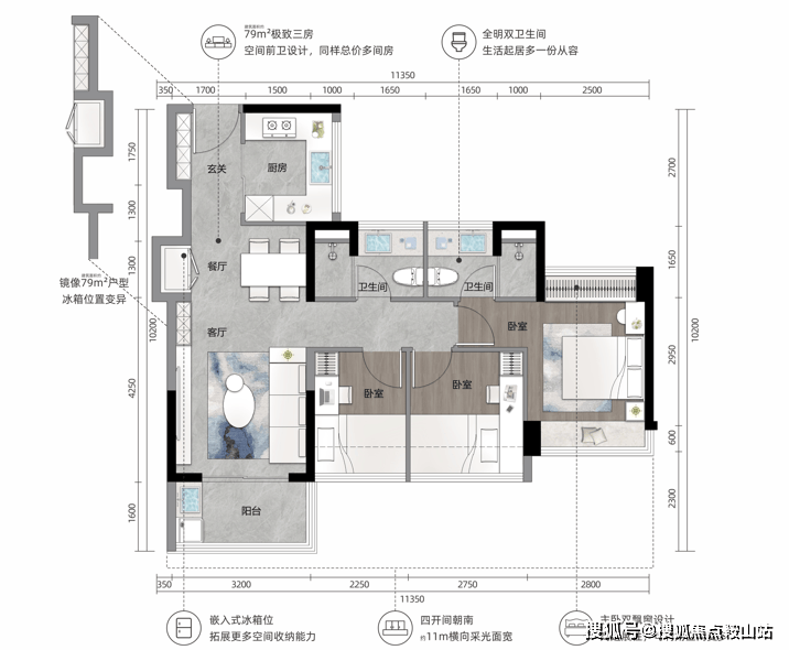 极致王炸户型|约79m²三房两厅两卫👈79m²三房顶配双明卫生间,四面宽朝南约11m采光面,送7个飘窗