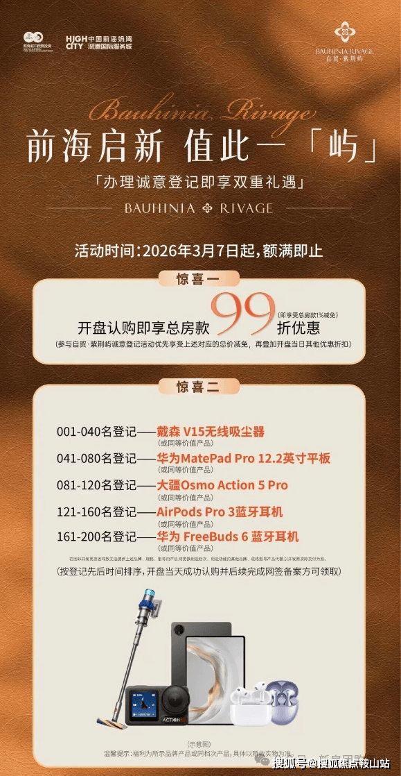 最新动态:前海妈湾湾啟紫荆府二期(紫荆屿)将于4月9日正式开放实体样板房,已诚意登记会优先参观),登记可享众多惊喜(参考下图),预4月中下旬开盘入市,面积段108-129-148㎡3-4房,售价预计在10-12万/㎡。