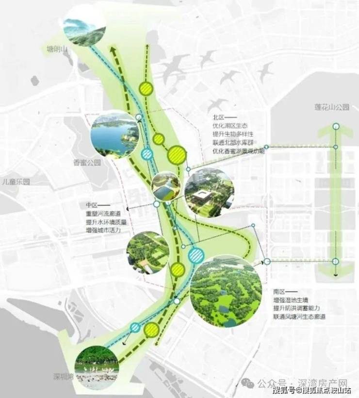 规划打造香蜜湖水廊,一直通向深圳湾,沿水廊建成城市公园、绿道和城市慢行道,高尔夫球场西侧约1/3的面积也纳入规划,将建成体育公园。