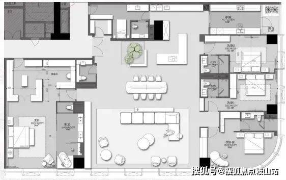 建筑面积约 439㎡,为 3 + 1 房 2 厅 2 厨 5 卫布局。该户型由 LSD 亲自操刀设计,拥有 270°城市与绿化景观,高区可看海景。采用全套房、双主卧设计,客餐厅开间超 10 米,方正主卧面积达 24㎡且为明卫设计,次卧带阳台,中西厨结合,还有多功能房,空间灵活多变。