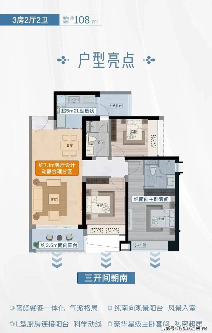 建面108平三房,三开间朝南,厨房L型,联通生活阳台,约3.5米的南向宽景阳台,视野非常开阔。