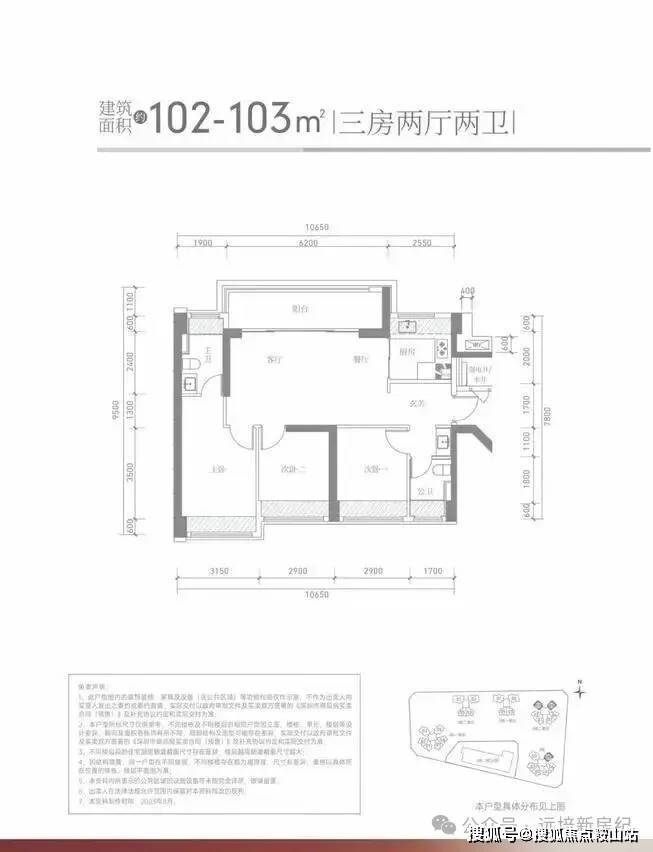 102㎡-103㎡的3房2厅2卫:横厅格局,主打的就是客厅宽大以及良好的通透性,客厅进深6.2米,开间3.7米(不含阳台),还配有长6.2米宽景阳台,这个户型很比较讨喜年轻的购房群体,因为横厅的户型南北通透,特别是深圳夏长冬短的地区;横厅户型还有一个优点,过道的面积少,同等面积空间利用率高,客厅或者房间的面积都稍微大些;