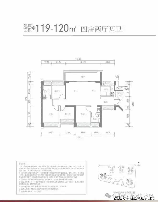 119㎡-120㎡的4房2厅2卫:南北通透横厅格局,客厅进深6.4米(不含阳台),开间3.8米,配有6.4米宽景阳台,户型图中的次卧二和次卧三,不包括飘窗的的情况下是2.5*2.5,飘窗打掉以后卧室有9-10平米,