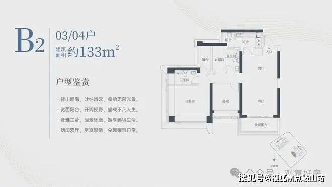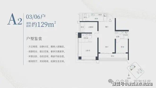 124㎡的3房2厅2卫:设计的是双龙抱珠格局,客厅超大观景阳台,东南朝向,缺点有黑卫,小卧室对天井外走廊采光