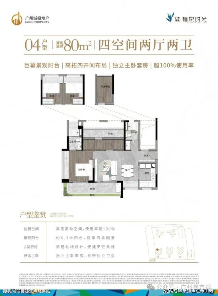 新加推80㎡户型(四房两厅两卫):6.3米宽阳台,使用率超100%!整个花都首个80方能做4房户型!