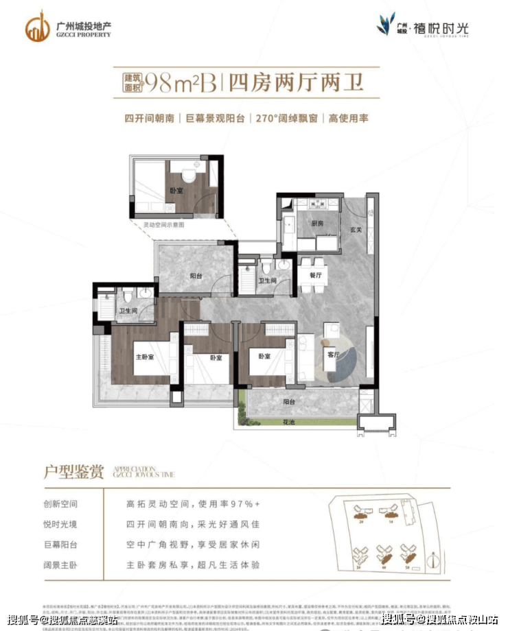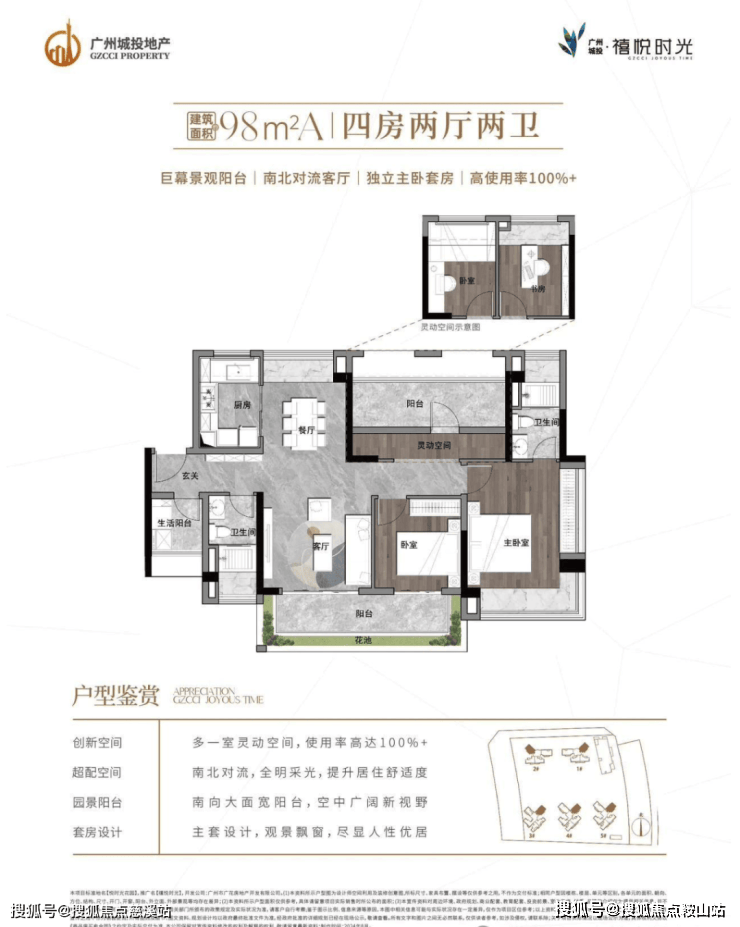 约 98㎡A 户型(四房两厅两卫):同样具备巨幕景观阳台,客厅南北对流,设有独立主卧套房,使用率高达 100% 以上。多一室灵动空间,增加了户型的实用性,南向大面宽阳台,视野开阔。