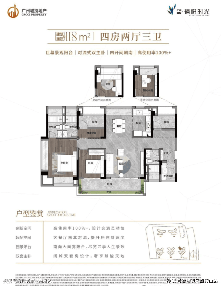 约 118㎡户型(四房两厅三卫):拥有巨幕景观阳台,采用对流式双主卧设计,四开间朝南,使用率超 100%。客餐厅南北对流,居住舒适度高,还有阔绰双套房设计,为业主提供奢享静谧的居住空间。