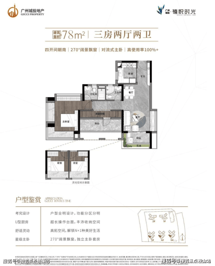 约 78㎡户型(三房两厅两卫):四开间朝南,带有 270° 阔景飘窗,主卧采用对流式设计,使用率超 100%。户型全明设计,功能分区明确,U 型厨房操作台面长,收纳空间丰富。