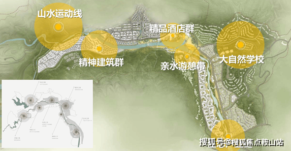 项目耗时四年对8.5平方公里的溪流山谷做了全域统筹规划,以“一个人的精神湾区”构想和科学系统性的规划理念,汇聚群山、树林、草甸、翠竹、温泉等大地艺术,凭借“精神建筑群、亲水游憩带、精品酒店群、大自然学校、生态产业链、山水运动线”六大规划主线串联“艺术之野、悠游之川、颐养之镇、风尚之谷、创意之丘、乐活之森、寻秘之境”七大主题板块,匹配“酒店、艺文、餐饮、儿童、运动、休闲、教育、便民”八大系统脉络,构建全系运营的配套逻辑,为不同时段、不同年龄的个人及家庭提供理想化度假生活形态空间与内容,让被城市孤立的现代人可以饱飨山与水的多界面体验。