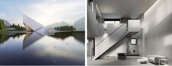 小镇生活体验馆:由大匀设计,是一座通排落地玻璃窗的白色建筑,位于小镇中心湖大草坪一侧。现代极简的几何造型,窗明几净的材质搭配,赋予场馆特殊的标志符号。它是游客到访小镇的第一站,是文化展览等活动的举办地,也是社区业主的精神空间,人们在此阅读、会谈、聆听、交流。