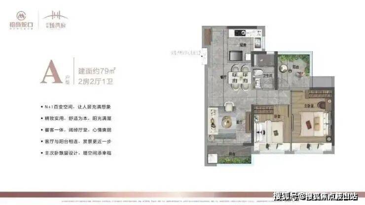 建面约79㎡ 2+1房1卫,L型厨房,客餐厅一体,设计通透;主次卧均带飘窗,空间感更大。