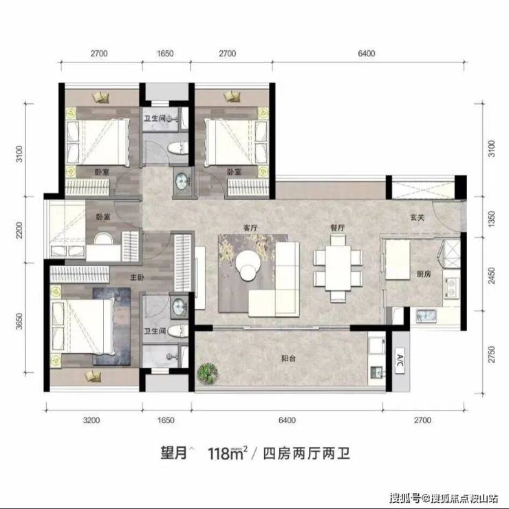 ③建面约118㎡的四房,拥有约6.4米的宽景阳台,加上约3.7米的餐厅飘窗,景观、采光、通风度满分。