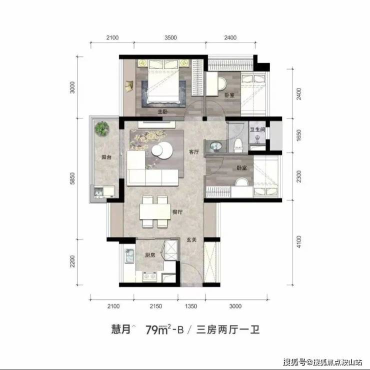 ①建面约79㎡户型能做到三房,使用率高,且有横厅和竖厅2种设计。