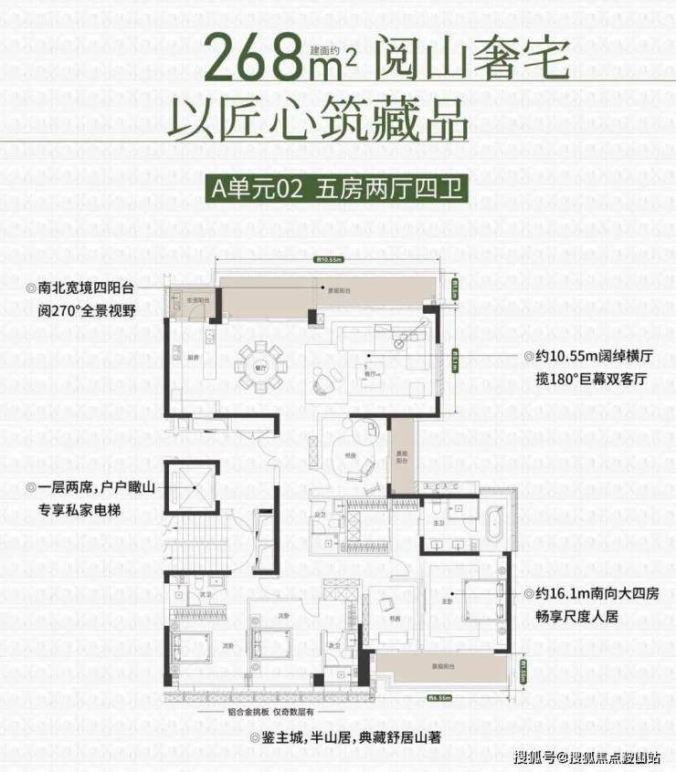 同样的专梯入户,豪宅感扑面而来,该户型为顶级大户型,四阳台设计,最大有10.55米的景观阳台和180度视野的餐客厅空间奢阔气场尽显,罕见的南北瞰景四阳台设计,让家的每个角落都能欣赏美丽的山景和城市景观。所有的开窗面都尽可能放大,客餐厅、书房、卧室、几乎都能享受超宽超大屏