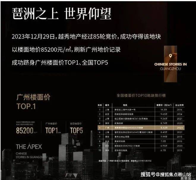 琶洲・樾|华樾的诞生源于 2023 年底广州土地市场的一场激烈角逐。琶洲西区 AH040331 地块开拍时,9 家房企竞相争夺,经过 85 轮竞价,最终越秀以 7.56 万 /㎡的楼面价拿下,刷新广州土地楼面单价纪录。项目坐落于广州 CBD 黄金三角之一的琶洲西区核心腹地,邻近地铁 8/18 号线磨碟沙站及新光、华南双快线,路网立体。南侧毗邻黄埔涌滨江生态带,与琶洲南 TOD 隔江相望,北面是琶洲 CBD 企业总部摩天集群,兼具滨江与城脉双重景观资源。项目占地约 2.37 万㎡,建面约 4.96 万㎡,绿化率 35%,仅 1 栋 96 户,产品为 248/254/330㎡超大户型,户户江景。