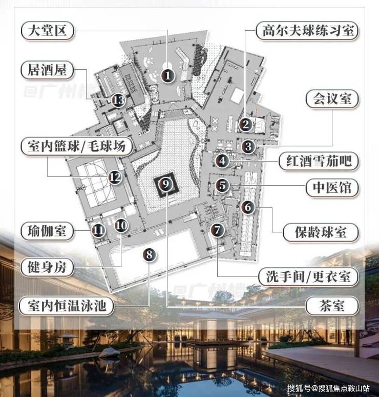 - 亚太设计师小坂竜、日本枯山水大师小林政彦联袂操刀,融合日式园林与东方禅意,下沉式会所、湖中茶室营造隐逸氛围。