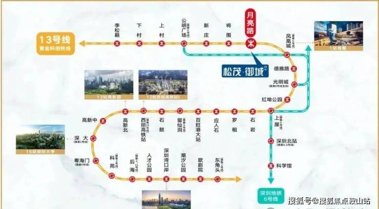 直线距离约400m到达地铁13号线月亮路站(建设中),1站凤凰城,9站到南山(约30分钟到达南山)。2025年将推动13号线二期(北延)建成通车(信息来源:宝安日报)。
