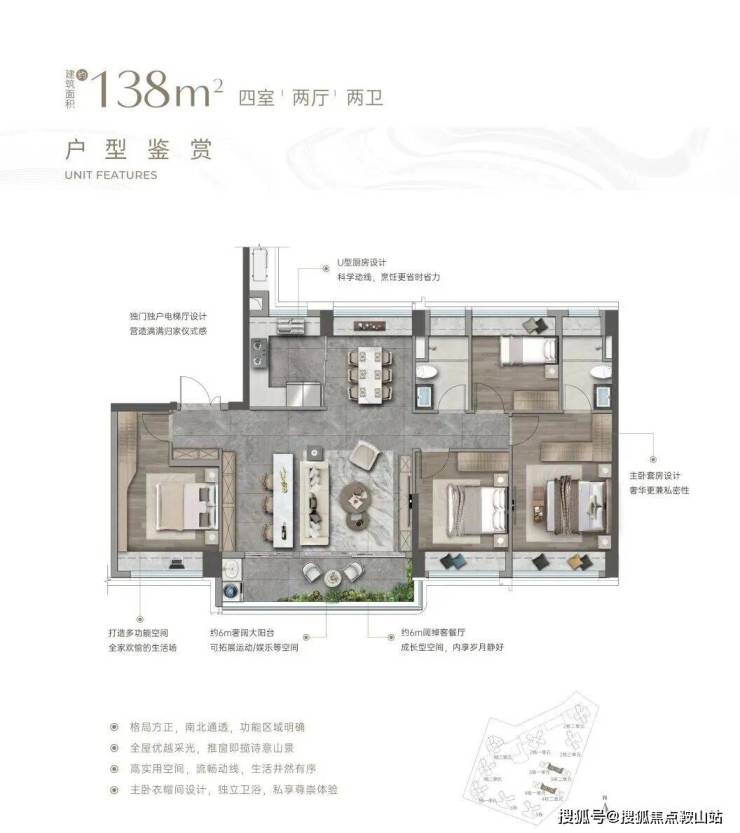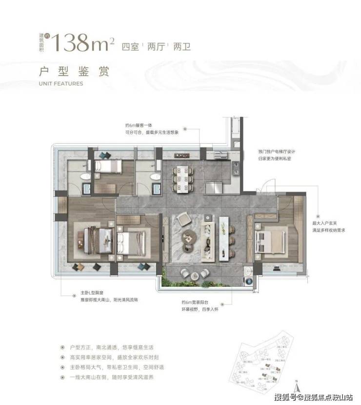 138㎡楼王户型:打造6.8米宽厅+双套房格局,客厅连接约7.2米景观阳台,实现山海景观最大化导入。主卧采用270°转角飘窗,配备独立衣帽间与明卫,打造酒店式居住体验。采用2梯2户专梯入户设计,私密性与尊崇感并存。