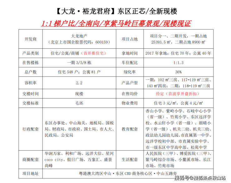 2、项目核心亮点🔸一、湾区腾飞,3000亿的引擎。粤港澳大湾区位列全球四大湾区经济体,是全球经济重要增长之极,抢滩湾区,即是抢占未来,而中山作为湾区中心城市,交通基建,迅速崛起。城轨、高速、快线、路桥四维交通,锻造世界湾区生活圈。🔸二、黄金脉轴,城市大动脉。裕龙君府位于中山路以及紫岭东路交汇处,正处中山三横四纵大交通核心;东区CBD商务核心区,与博爱路、长江路、中山路三条重大城市主干道交汇,未来城轨1、2号线重点辐射地段。🔸三、顶级醇熟配套。2公里范围内享星河CoCo city、利和广场、盛景尚峰、远洋大信、假日广场、万象汇等6大成熟商圈;出门即达东区办事处、中山海关,快速抵达地税局、国税局、财政局、市政府、国土局、市人大、民政局、公安局。🔸四、揽城央氧肺享千亩山林。君临1300亩城央公园绿肺,推窗清风入户,尽揽自然美景,享受纽约中央公园式惬意人生!双园环绕,自然无缝对接。出享繁华,入享宁静。置身千亩负离子城市森林公园,处绿氧中呼吸生活,礼遇少数人。