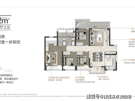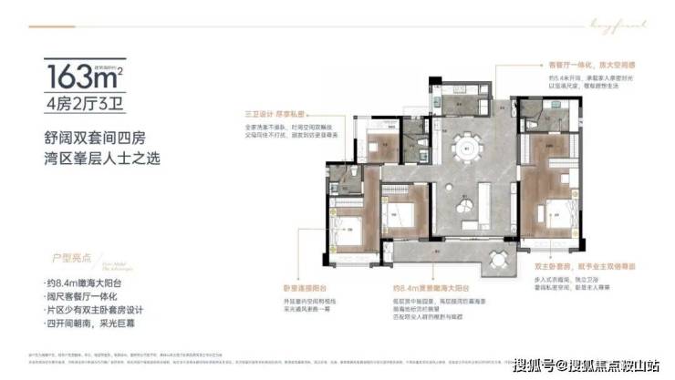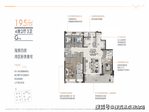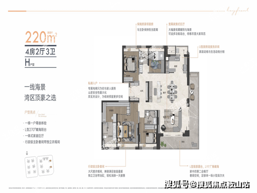 格局:专梯入户、270° 一线海景、双主卧套间、独立家政间