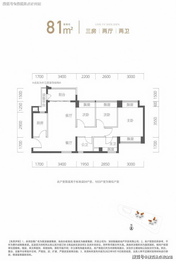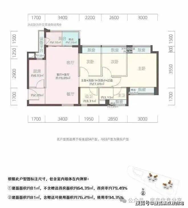81㎡的3房2厅2卫,设计的是竖厅南北通透格局,客厅3.4米开间,3个卧室分别是3米/2.6米/2.2米的宽度,L型厨房,得房率:94.35%(包含赠送),阳台西北或东北朝向