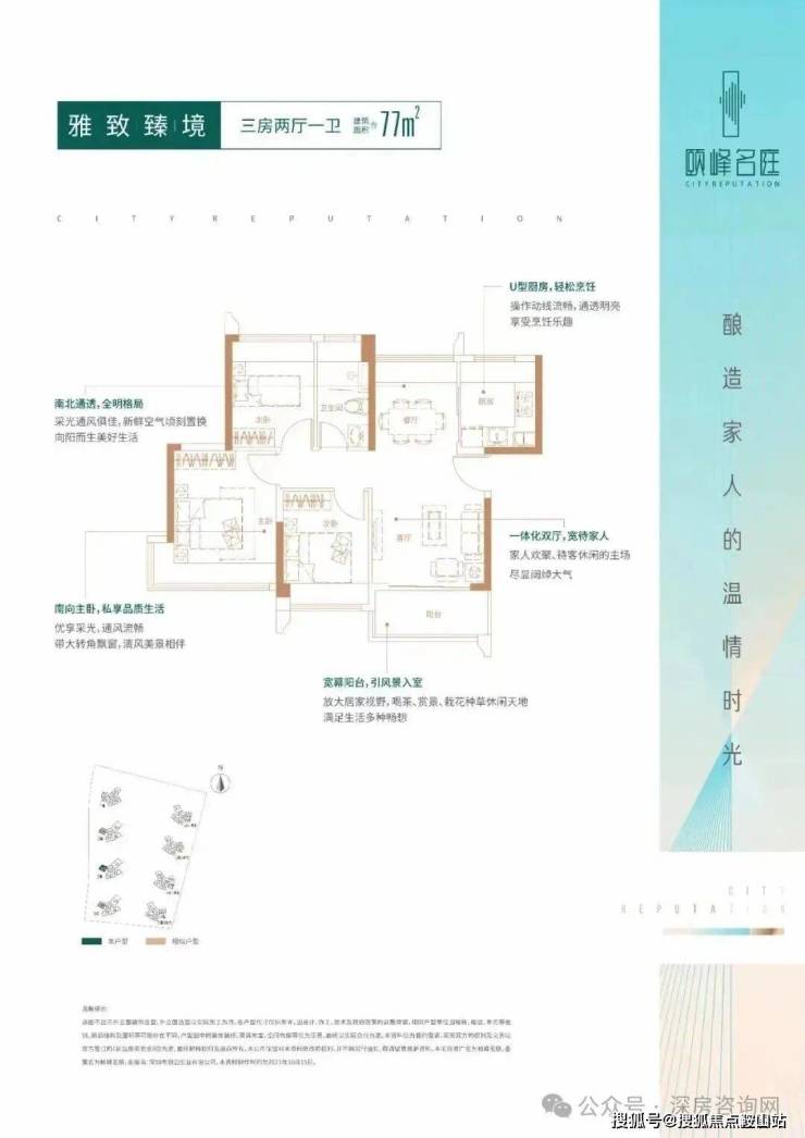 方正户型格局,合理的动线规划,让一家人的生活,亲密而又保持恰当的距离;客厅与阳台、餐厅一脉相连,空间更敞阔,家人欢聚畅饮之时,一起享受追剧的欣喜;U型厨房,流畅的操作动线,于启开启一场酝酿美味的舌尖之旅。其中建面约77㎡户型,南北通透格局,高得房率打造三房奢享,即使家中两个孩子亦能阔享。