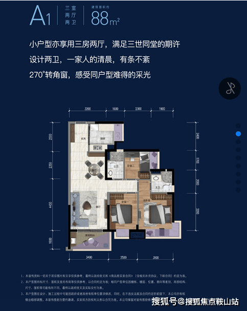 项目户型建筑面积从约88㎡至239.9㎡。囊括三室、四室、五室,大户型尺寸宽绰,空间可进可退,小户型小而精致,居家功能、景观阳台齐备,满足一家三代的居住需求