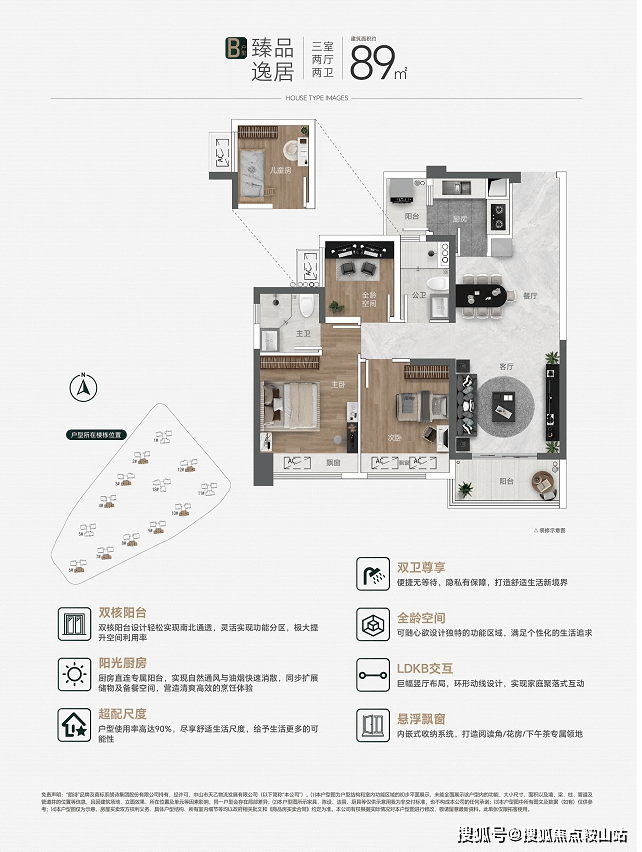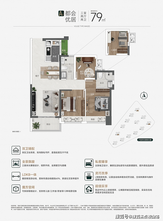 ★ 建面约79㎡2+1房:双卫甄配,小面积也能实现“双开间朝南”,首付8万起即可上车珠中双城生活