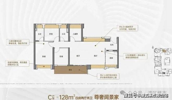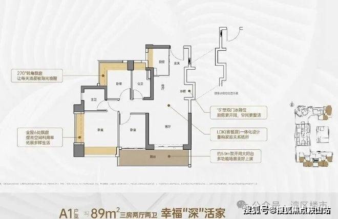 客厅约3.5米开间,LDK一体化设计,约5.9米双开间大阳台,主卧双面飘窗,全屋6面飘窗