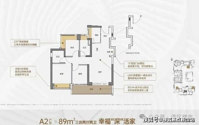 客厅3.5米开间,LDK一体化,客厅连接次卧出5.9米双开间大阳台,次卧270°转角飘窗。