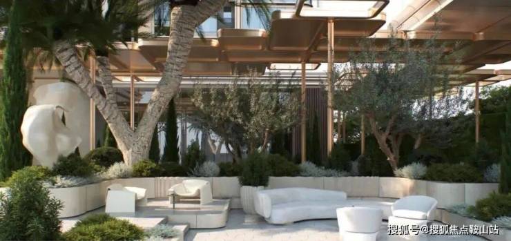 浮岛甲板层以“都市之中,自然之下”为核心意境,通过1.95米覆土构筑立体化绿植基底,精选树龄超50年的非洲象腿树,搭配东南亚越南进口多头苏铁,绿化环带的乔木直径均超50cm,实现“一景一树”的极致呈现。