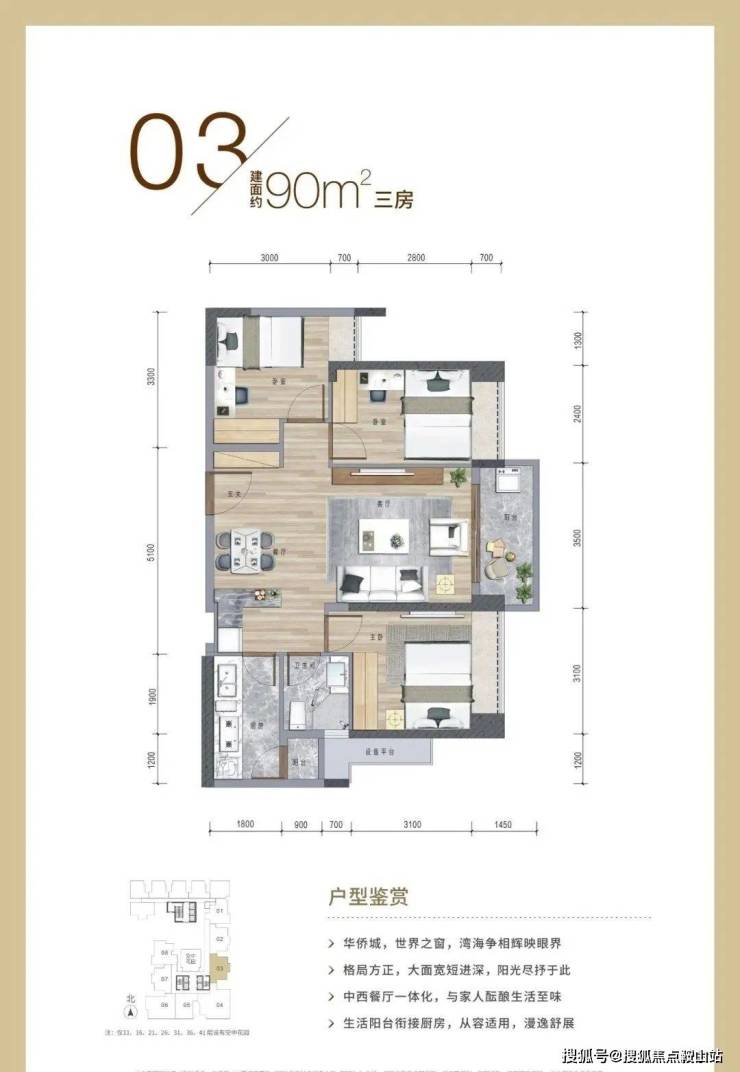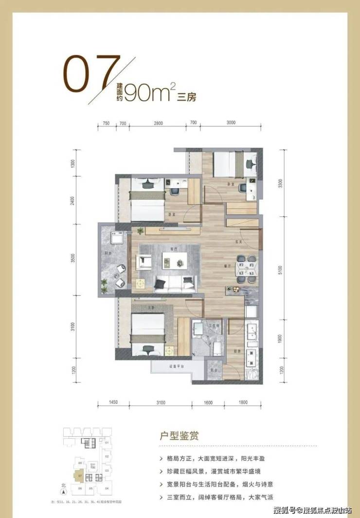 07约90㎡ 3房2厅1卫 总价:约990万 西向