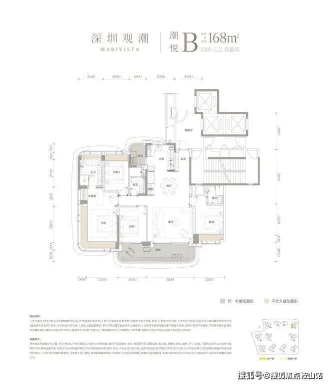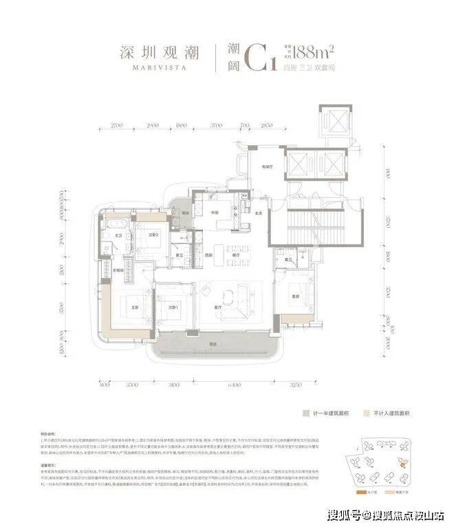 主阳台开间约9.5米,客餐厅开间约6.4米。三梯三户,独立私家门厅。东南或西南朝向,可看海景、摩天轮、城市景观。双套间设计,可做4+1房,中西双厨。