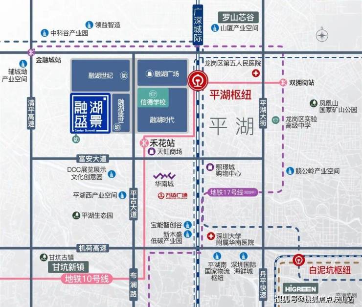 4地铁:项目距离10号线禾花站约500米(百度测距),连接坂田,直达福田中心区;另有规划中地铁17号线(直连罗湖口岸)/18号线(连通空港新城)/21号线(向西联系南山高新区、前海自贸区等高新区),通勤更高效;