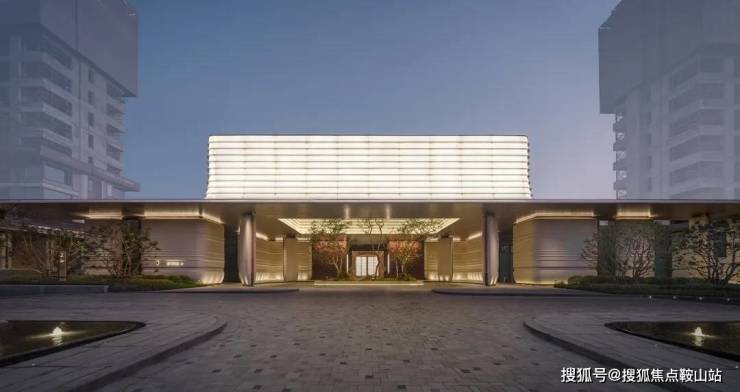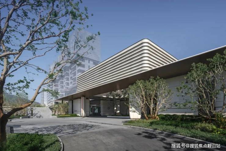 入口广场以人字形铺陈的石板地面为中心,两侧设低矮水渠。主入口摒弃了传统高耸大门或厚重墙体,代之以四根轻盈的弧形柱体,支撑起悬挑屋面。