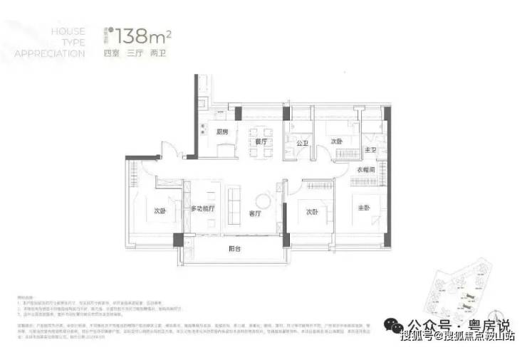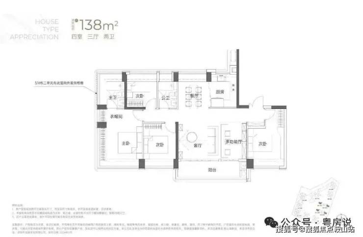 138㎡的4房2厅2卫:竖厅南北通透格局,专梯入户,客厅6.1米开间,LDKB一体化,全屋飘窗,4个卧室分别做到了3.9米/3.25米/2.9米/2.8米的宽度,主卧加1个次卧270°全景飘窗,客厅出6.1米长的大阳台,U型厨房,得房率约95-97%(包含赠送),阳台主朝西南向。138平米户型分布在3栋1单元、3栋2单元、4栋1单元、4栋2单,4个单元纯大户型。