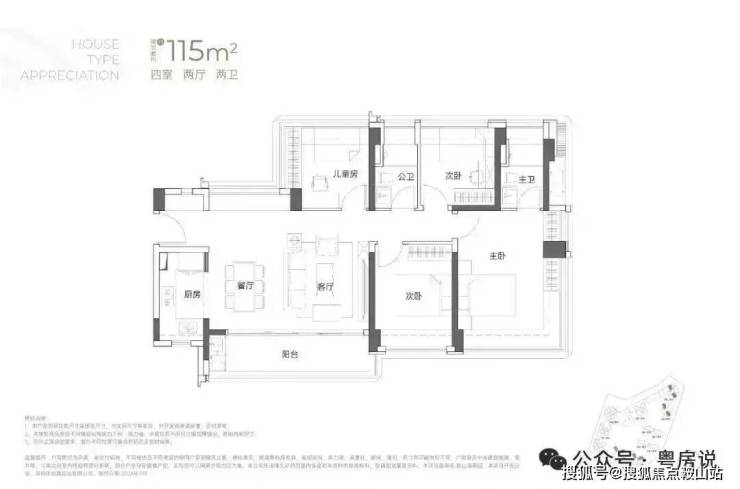 115㎡的4房2厅2卫:横厅南北通透格局,客餐厅6米开间,LDKB一体化,全屋飘窗,4个卧室分别做到了3.9米/3米/2.8米/2.6米的宽度,主卧加1个次卧270°全景飘窗,客厅出6米长的大阳台,L型厨房,得房率约95-97%(包含赠送),西南或东南朝向。115平米户型分布在1栋1单元、1栋2单元、1栋3单元01/02户型,01户型西南朝向都是看小区外围,02户型看向小区;