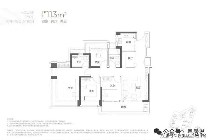 建面113平米:4房2厅2卫,传统的竖厅户型动静分区,‘S’型墙体,有冰箱预留位;市面非常常见的竖厅4房户型,比较突出的是有大阳台连接客厅和次卧;主卧和书房(卧室)都是多飘窗设计,保证了视野和多方面的采光;这种户型的缺点是走廊过长,空间利用率比横厅或者双龙抱珠户型差些;户型分布在5栋、6栋03/04户型,均是西南朝向,看小区外面大南山方向,比较安静;