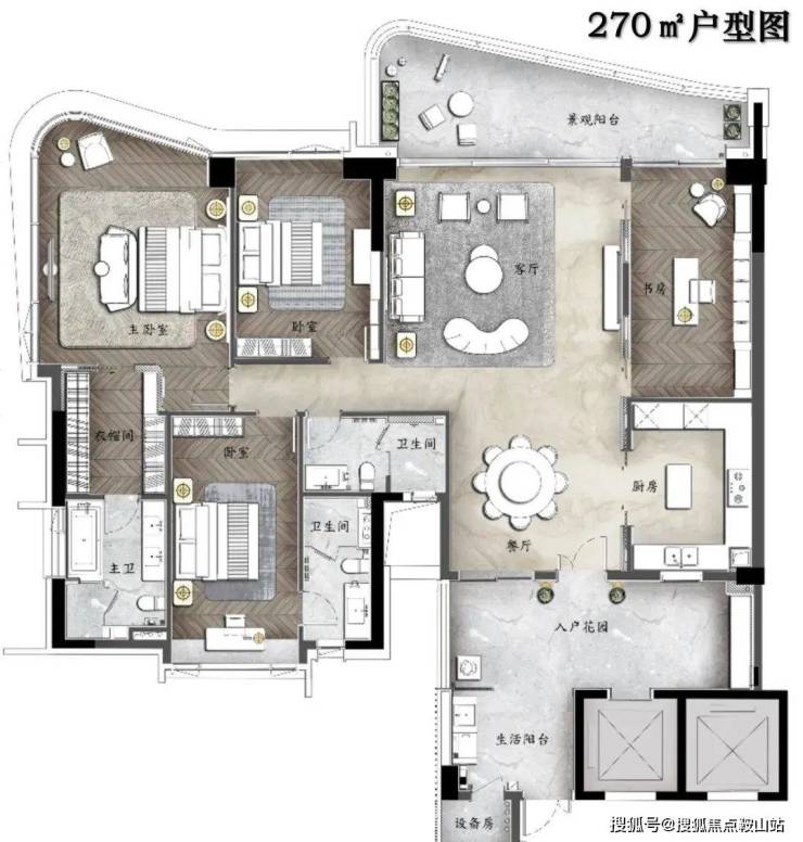 【A户型】王牌户型 270㎡环幕江景四房,约9米超大邮轮式阳台,一线望江无遮挡,专梯专户,墅级空中双花园,约28㎡超大私家庭院,多功能空间,约42㎡超大主卧空间,270°环幕江景,阔绰双主套房设计