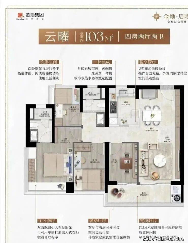 103㎡的4房2厅2卫,竖厅格局,LDKB一体,动静分区,四南向开间,主卧270°飘窗,U型厨房,公卫干湿分离,得房率90%(含赠),客厅餐厅连5.6米阳台,西南/东南朝向。