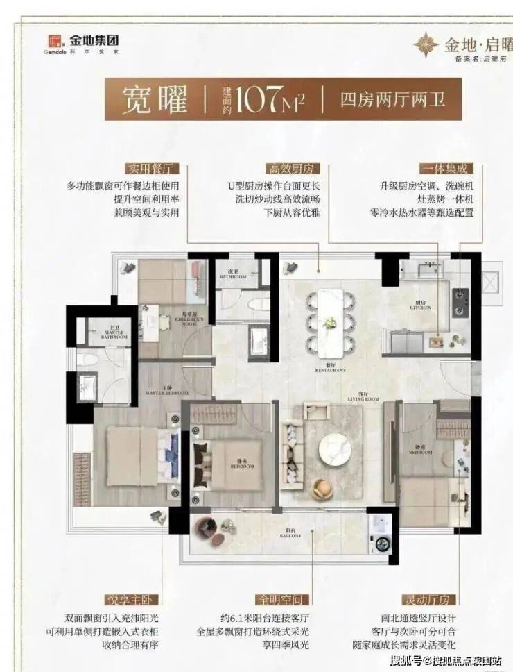 107㎡的4房2厅2卫,设计:竖厅南北通透,客餐厅分离,四室朝南,主卧270°飘窗,U型厨房,公卫干湿分离。得房率约90%(含赠送),客厅餐厅通6.1米阳台,西南向。