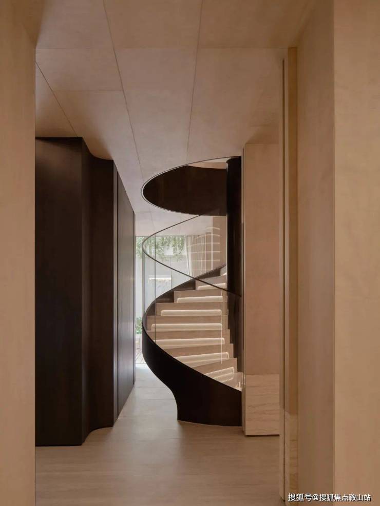 地下空间包含了一个夹层和全明地下室,旋转楼梯为空间平添动态。设计师借此打造了会客厅、书房、沙龙室、健身房等空间,充分考虑到了当代生活的多元场景。直通地下的下沉式庭院,保证了地下空间的全明光照与空气流动。