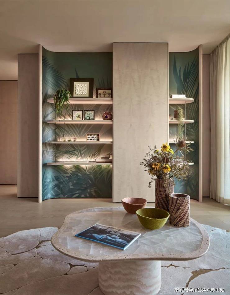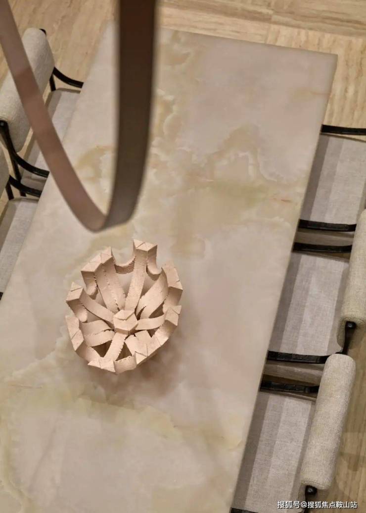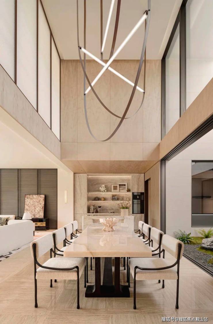 大面积使用的意大利超白洞石,石材的横向纹理与天然孔洞让人不禁触摸、感知;墙壁上的浅色影木木饰面在变换的阳光下反射着微光;餐厅长桌的台面则使用奢石汉白玉,质感温润如玉,呼应湖居生活的主题。