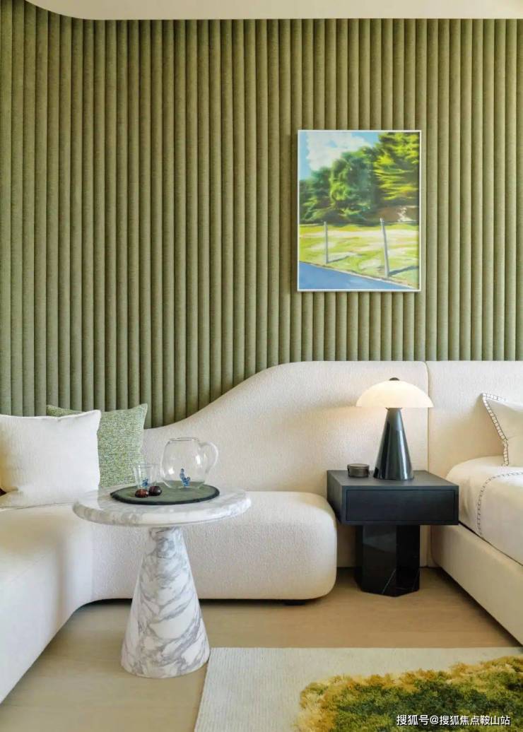 儿童房以自然为灵感,床头的墙饰面采用了苔藓绿色的软包,地毯也彷若一片微缩的苔原。在设计师看来,不管对于成人还是孩童,大自然永远是最好的老师。人们在自然中漫步、探索、畅想,从中汲取灵感,也得到疗愈。这样的房间,大概会在孩子的记忆中保留很久很久。