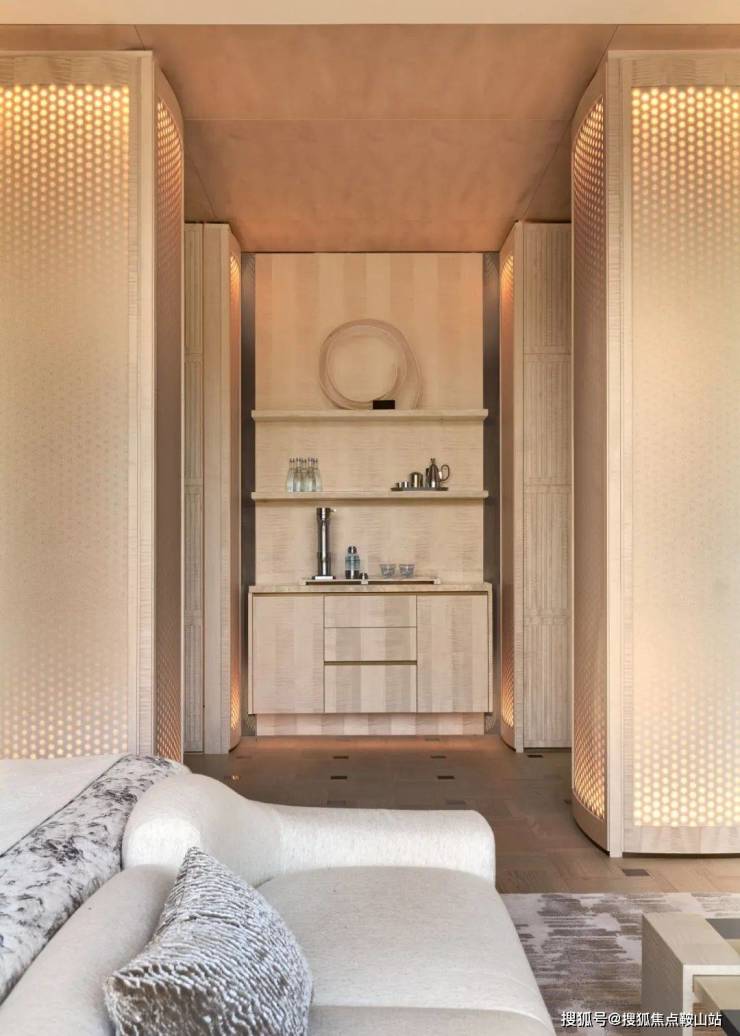 夹层用木格栅包裹起一个“盒子”作为疗愈空间,集冥想静修、瑜伽舒展与健身训练于一体。当自然光线穿透格栅洒入室内,在墙面与地面投射出韵律分明的光影矩阵,这种随时间流转的光影戏剧不仅营造出沉浸式的空间氛围,更通过人与环境的深度交互,引导使用者达成身心平衡的疗愈体验。
