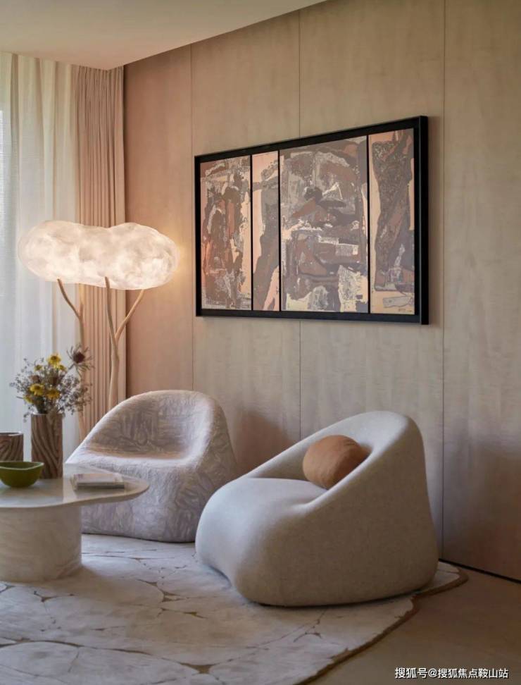 书房一侧的作品《中国式山水》来自艺术家应麦可。设计师为其搭配一把造型独特的转角扶手椅,可容纳双人的尺度,恰好为亲子阅读留出想象力。空间中的每一个角落都可观、可赏,引人细细推敲。