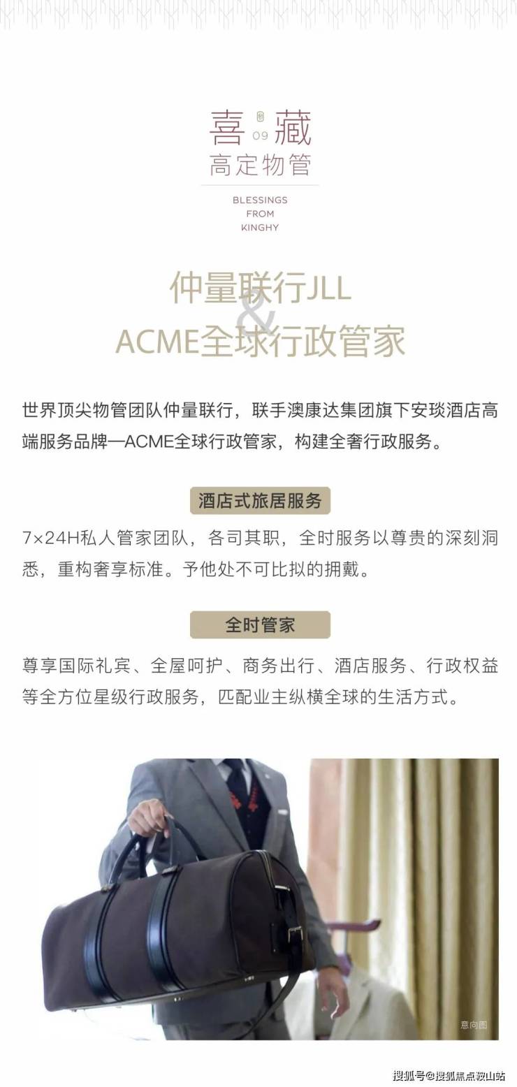 熟知高净值人群全球旅居生活的习惯与视野,璟喜特别采用澳康达集团旗下安琰AYEARN酒店高端服务品牌—ACME全球行政管家,以定制化酒店式旅居服务为内核,为塔尖圈层构建全奢行政服务。7×24H私人管家团队,各司其职,全时服务,以尊贵的深刻洞悉,重构奢享标准。酒店式旅居服务,尊享国际礼宾、全屋呵护、商务出行、酒店服务、行政权益,全方位星级行政服务,来匹配业主纵横全球的生活方式。