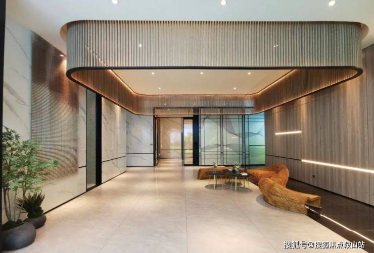 双精装入户大堂,是新世界天澜的做法,楼栋入户大堂外部区域,以木饰墙面、大理石、栅格等元素点缀,形成一个衔接户外与入户大堂的“中转站点”。