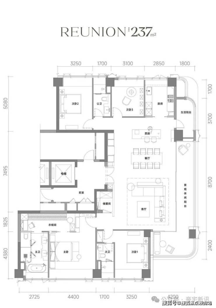 •尺度革新:建面约197m²户型,专梯入户设计。户型格局极致方正,动静分区清晰,实现了三面采光与双南向套房的“双龙抱珠”格局。